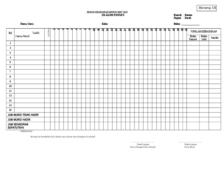 Nama murid e a u menu m l m rmt a u l s a a h 1. Guru kelas juga bertanggungjawab dalam mengambil kehadiran murid setiap hari dan mestilah di catat di dalam Buku Rekod Kedatangan Murid. Jika boleh tampal sahaja fungsi ini dapat memudahkan kerja guru kelas.