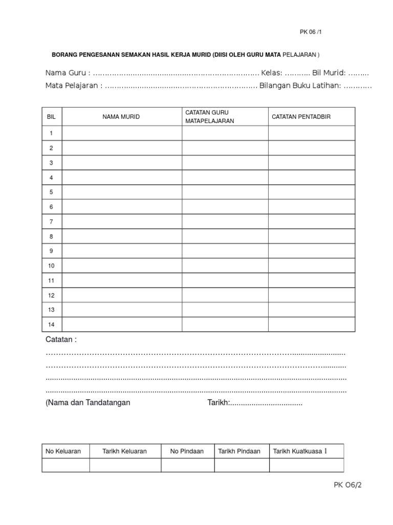 The copyright of the image is owned by the owner this website only displays a few snippets of several keywords that are put together in a post summary. Pk 06 1borang pengesanan semakan hasil kerja murid diisi oleh guru mata pelajarannama guru siti musiah binti matnor kelas. REKOD PENYEMAKAN BUKU LATIHANKERJA MURID Bil Kelas Bil.