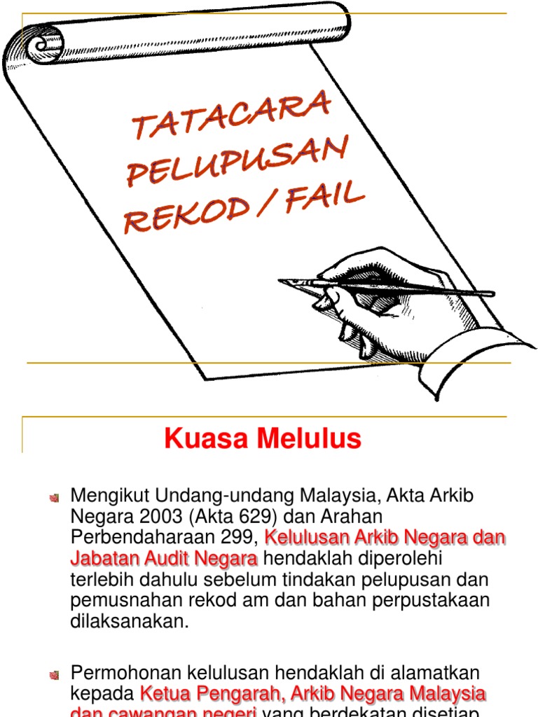 Nov 17 2015 Permohonan pelupusan hendaklah dibuat kepada Arkib Negara Malaysia ANM Pelupusan rekod yang sistematik bagi mengatasi masalah pengurusan penyimpanan dan penjagaan timbunan rekod yang tidak aktif. 3 salinan mengikut susunan 7. Dilaksanakan termasuk mengenalpasti fail-fail yang boleh ditutup cara penutupan dan pengasingan fail bagi tujuan pelupusan.