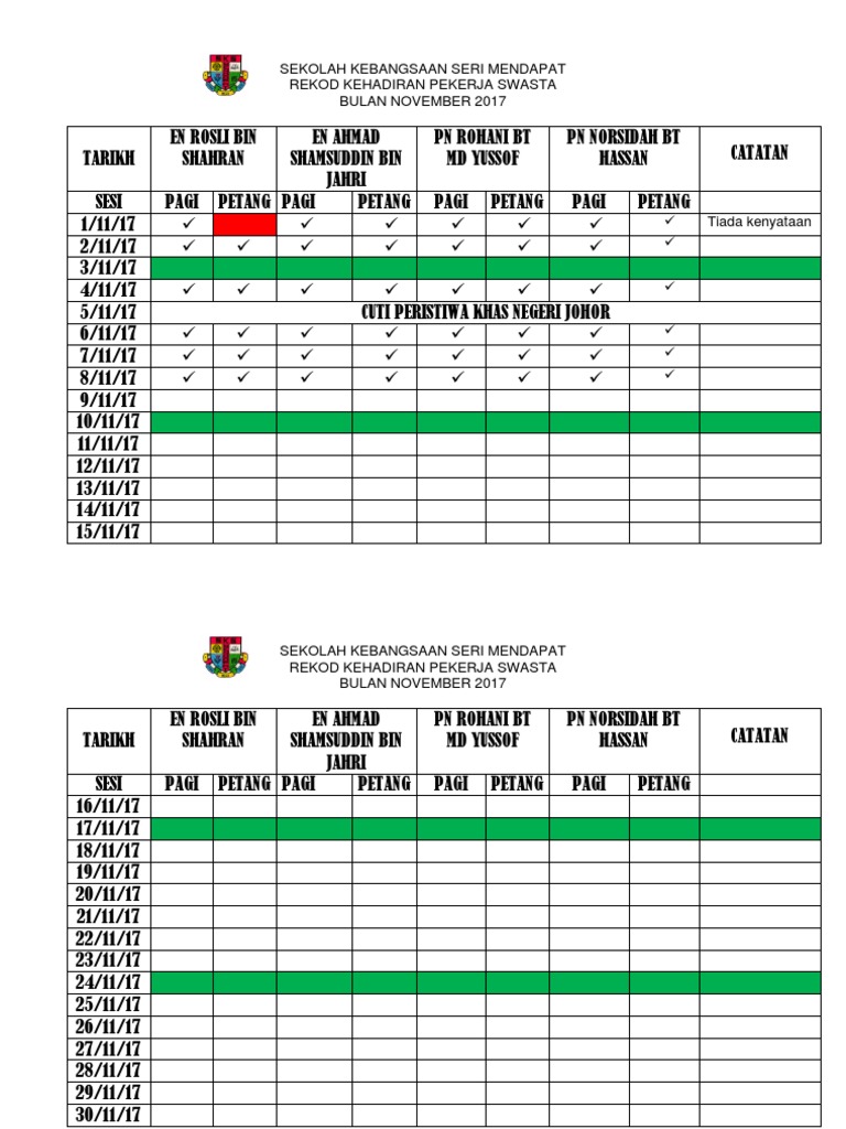 Untuk makluman anda semua fail ini boleh disunting diedit. Contoh Rekod Kedatangan Pekerja. Guru kelas juga bertanggungjawab dalam mengambil kehadiran murid setiap hari dan mestilah di catat di dalam Buku Rekod Kedatangan.